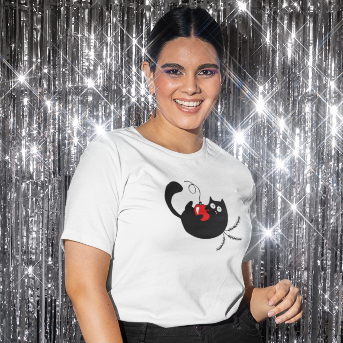 Balti UNISEX kalėdiniai marškinėliai "Juodo katinuko Kalėdos"