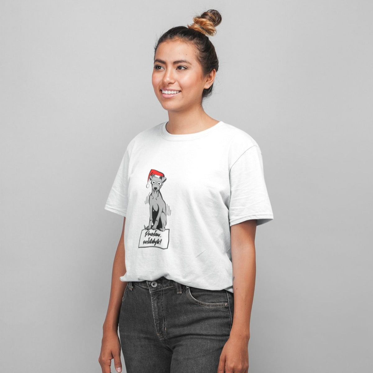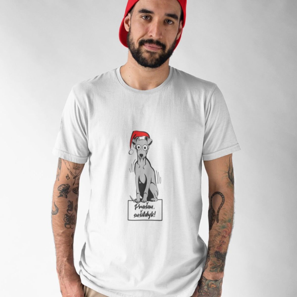 Balti UNISEX kalėdiniai marškinėliai "Prašau sušildyk"