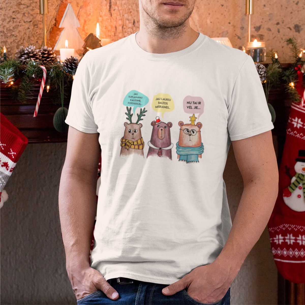 Balti UNISEX kalėdiniai marškinėliai "Trys meškinai"