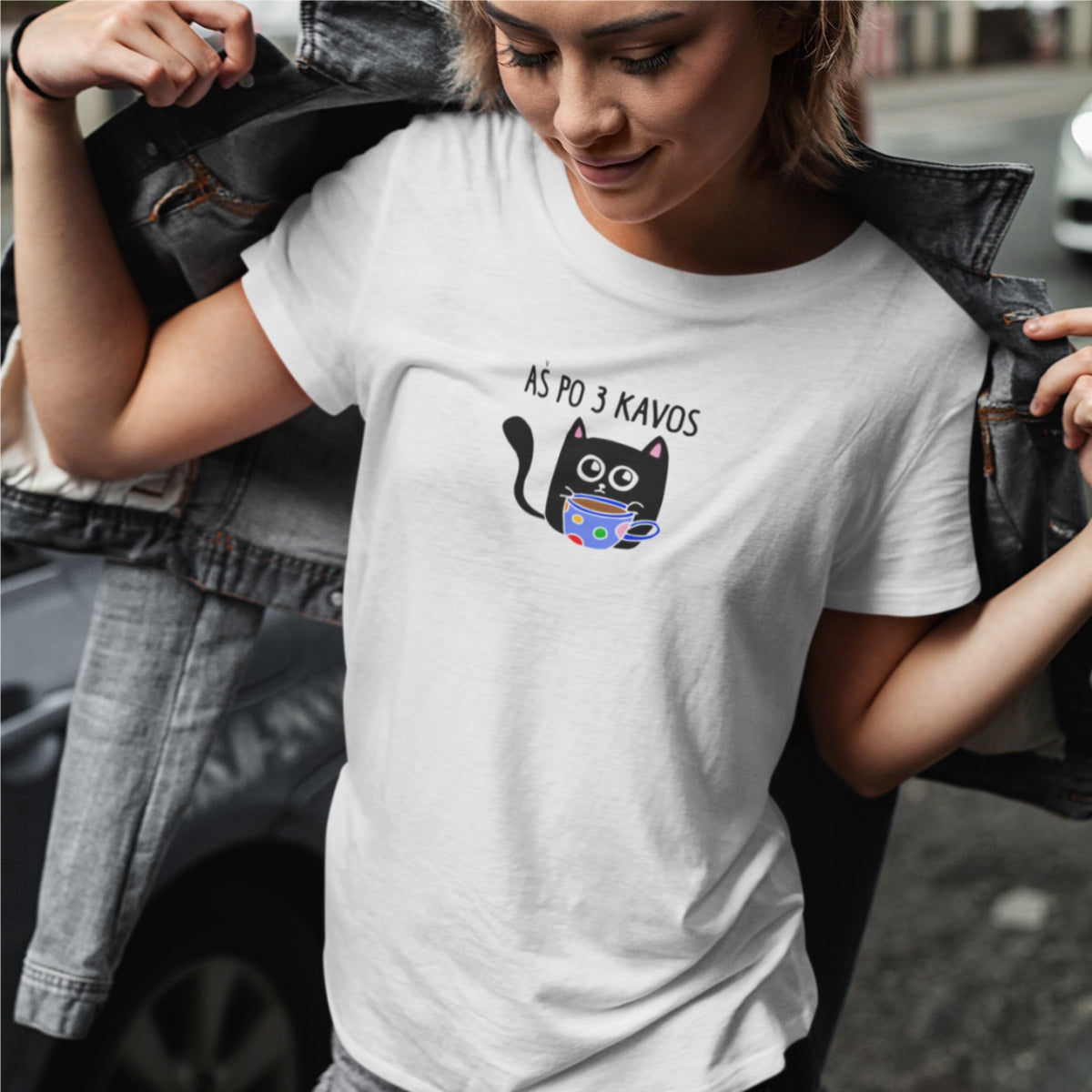 Balti UNISEX marškinėliai "Aš po 3 kavos"