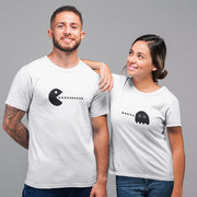 Balti unisex marškinėliai poroms „Pacman žaidimas“