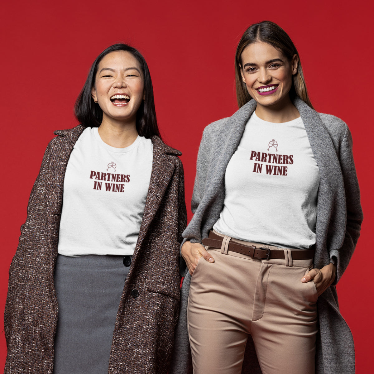 Balti UNISEX marškinėliai su linksmu užrašu "Partners in wine"