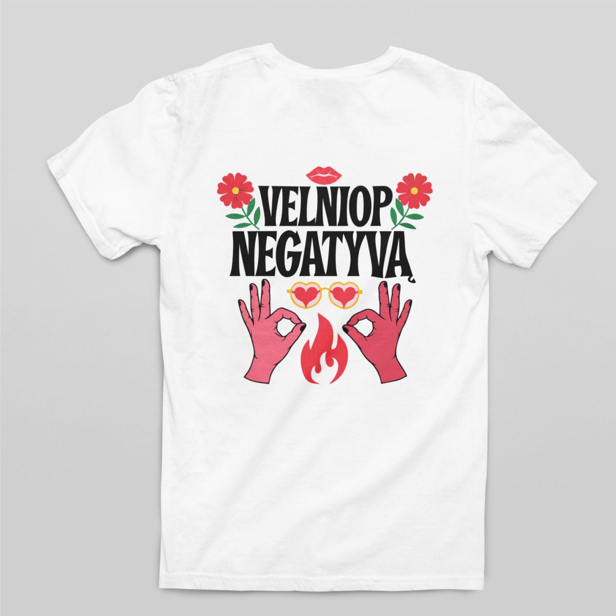 Balti UNISEX marškinėliai su spauda ant nugaros "Velniop negatyvą"