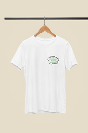 Balti UNISEX marškinėliai su spauda širdies plote "Tik nereikia mūsų gąsdinti!"