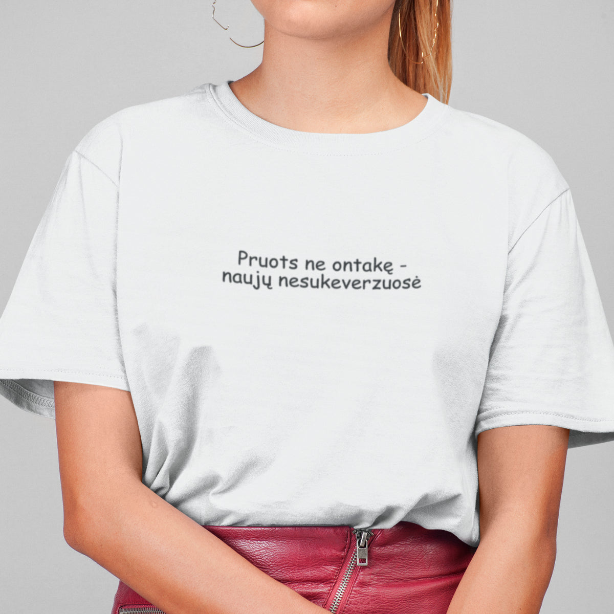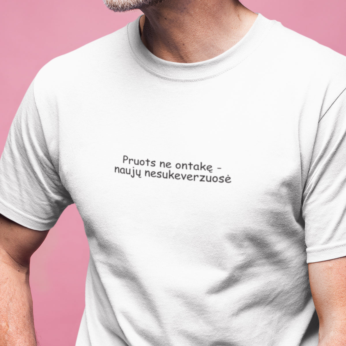 Balti UNISEX marškinėliai su žemaitišku užrašu "Pruots ne ontakę - naujų nesukeverzuosė"