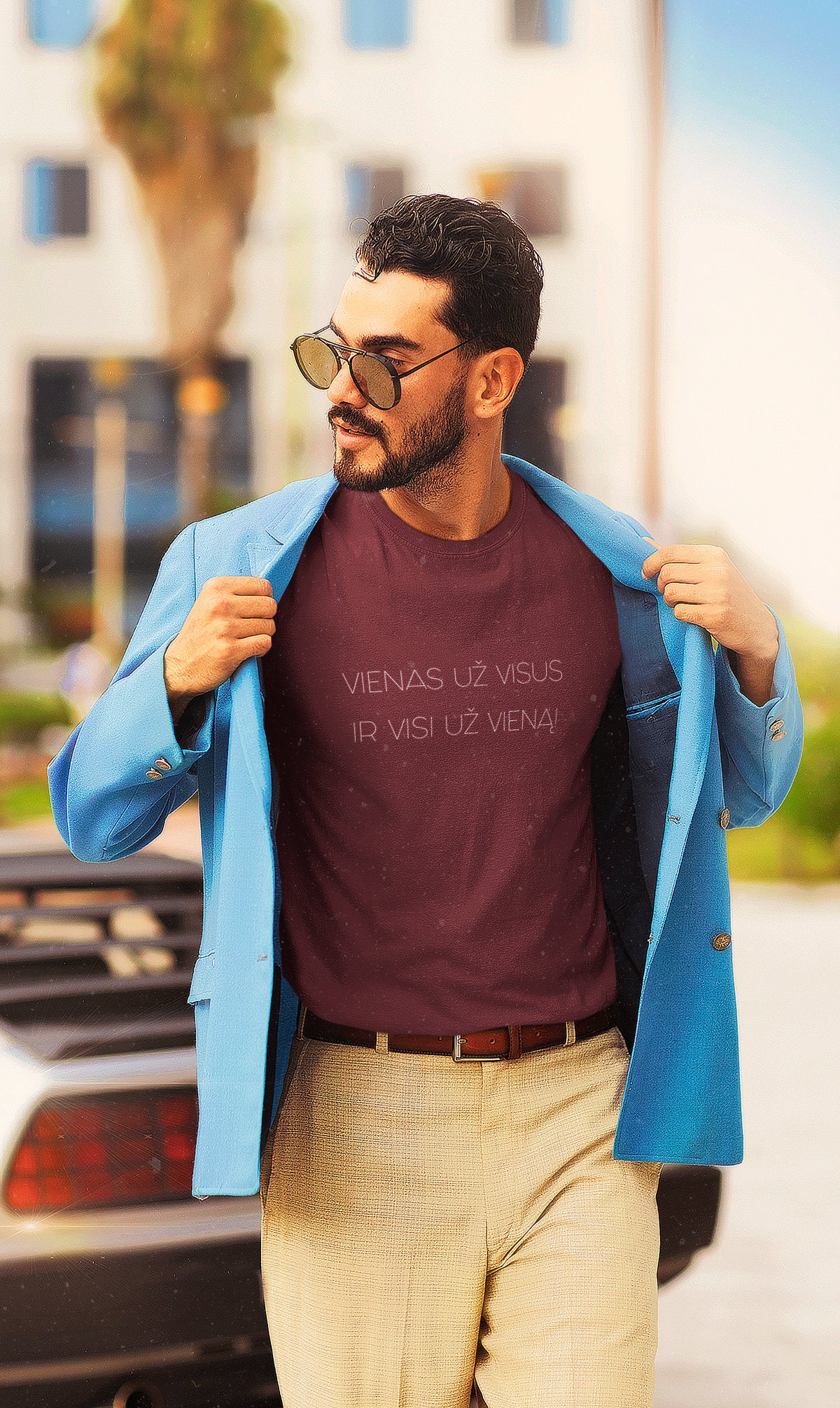 Burgundiški UNISEX marškinėliai "Vienas už visus ir visi už vieną"