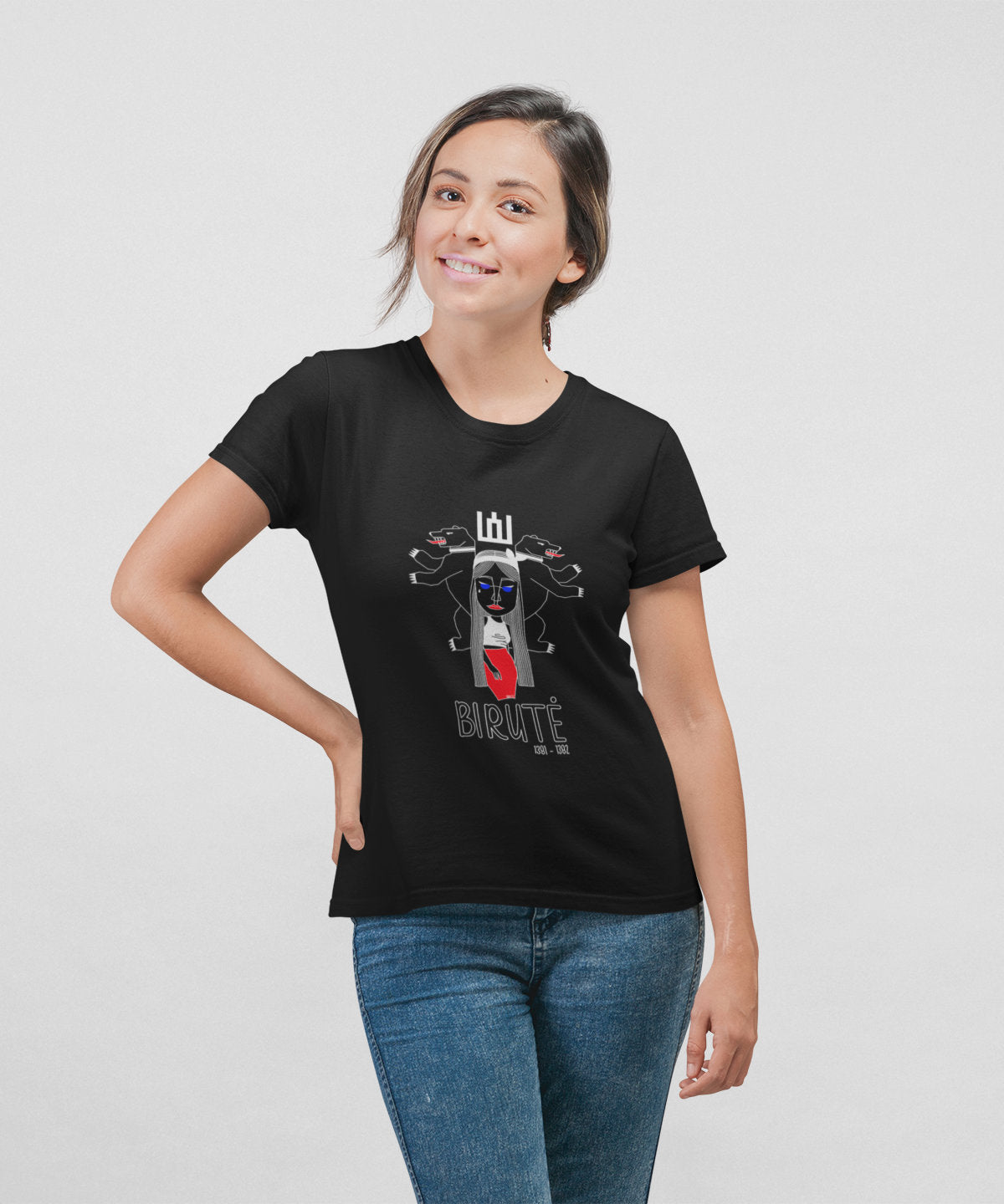 Juodi moteriški marškinėliai "LDK KUNIGAIKŠTIENĖ BIRUTĖ SU UŽRAŠU"