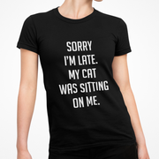 Juodi moteriški marškinėliai "Sorry (cat)"