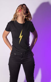 Juodi moteriški marškinėliai su auksiniu marginimu "Žaibas“ Pagaminta prekė (2XL)