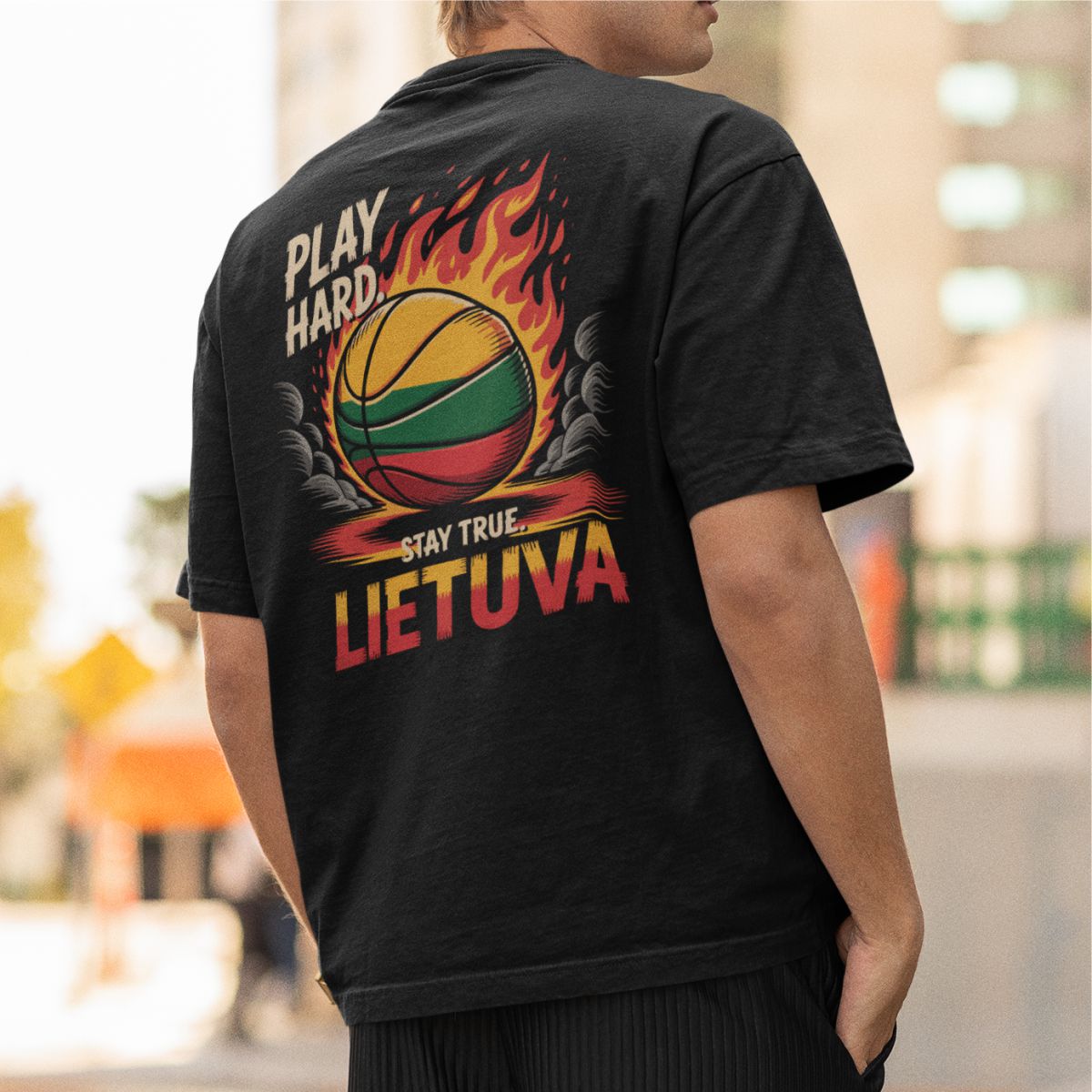 Juodi OVERSIZED marškinėliai su spauda ant nugaros "Play hard"