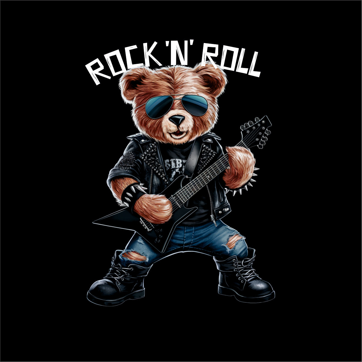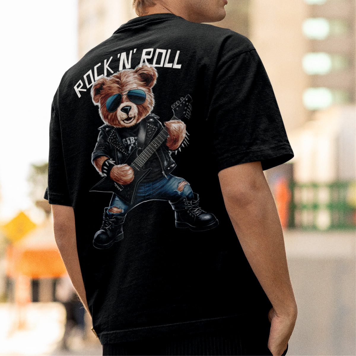 Juodi OVERSIZED marškinėliai su spauda ant nugaros "Rock 'n' Roll meškiukas"