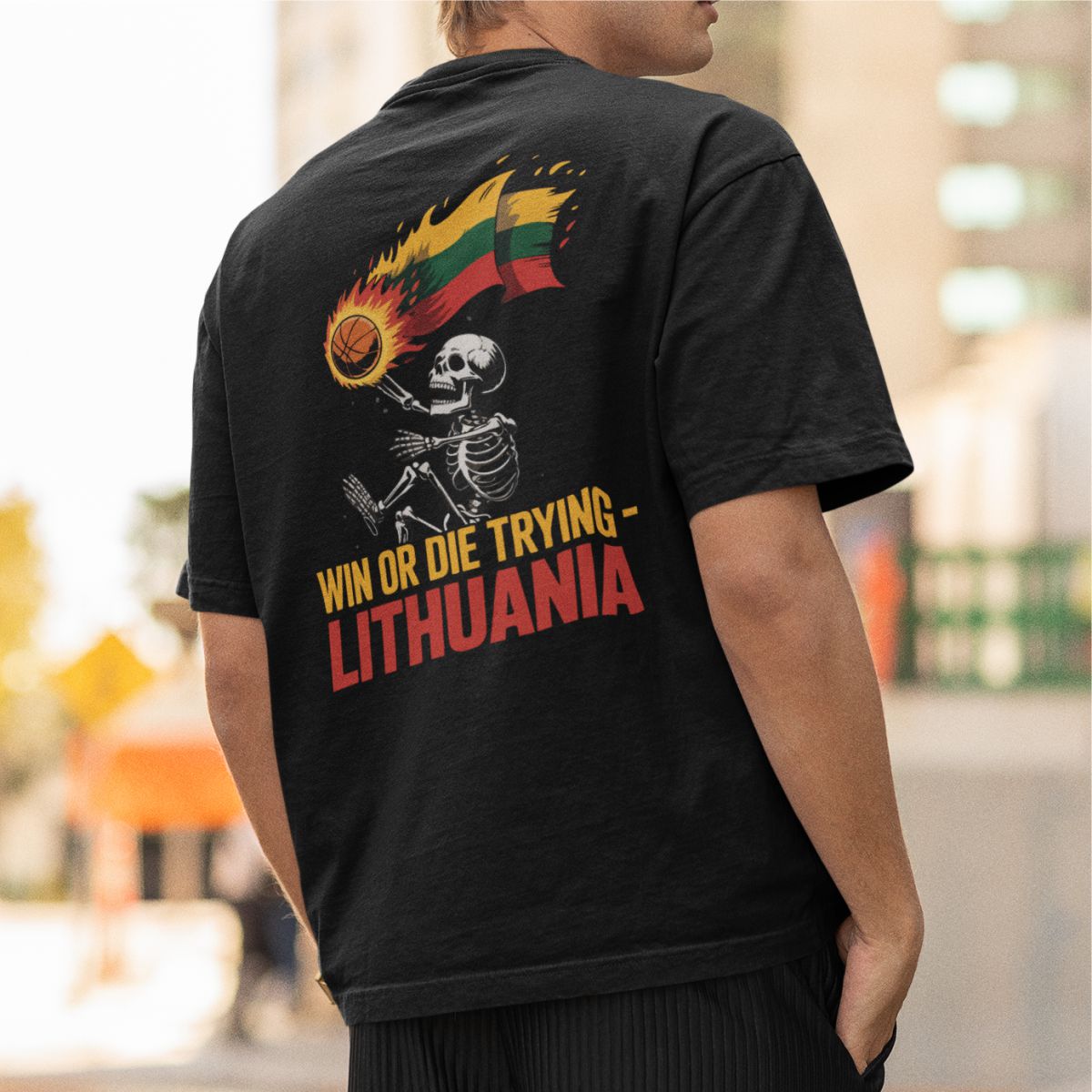 Juodi OVERSIZED marškinėliai su spauda ant nugaros "Win or die"