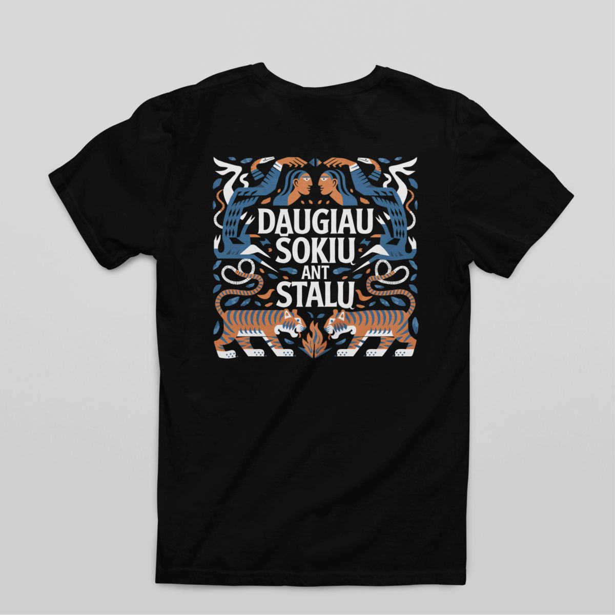 Juodi UNISEX marškinėliai su spauda ant nugaros "Daugiau šokių ant stalų"