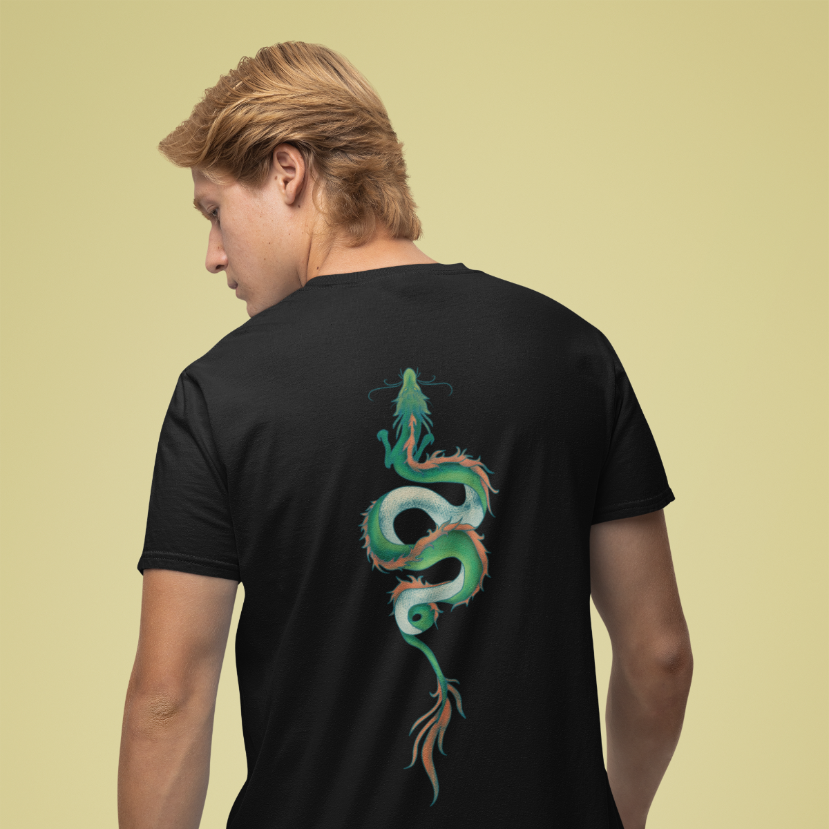 Juodi UNISEX marškinėliai su spauda ant nugaros "Drakono metai“