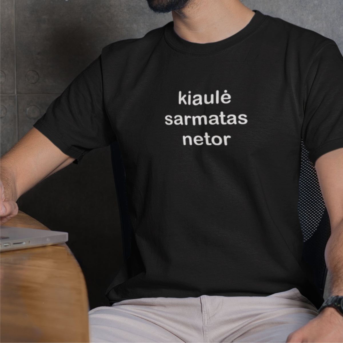 Juodi UNISEX marškinėliai su žemaitišku užrašu "Kiaulė sarmatos netor"