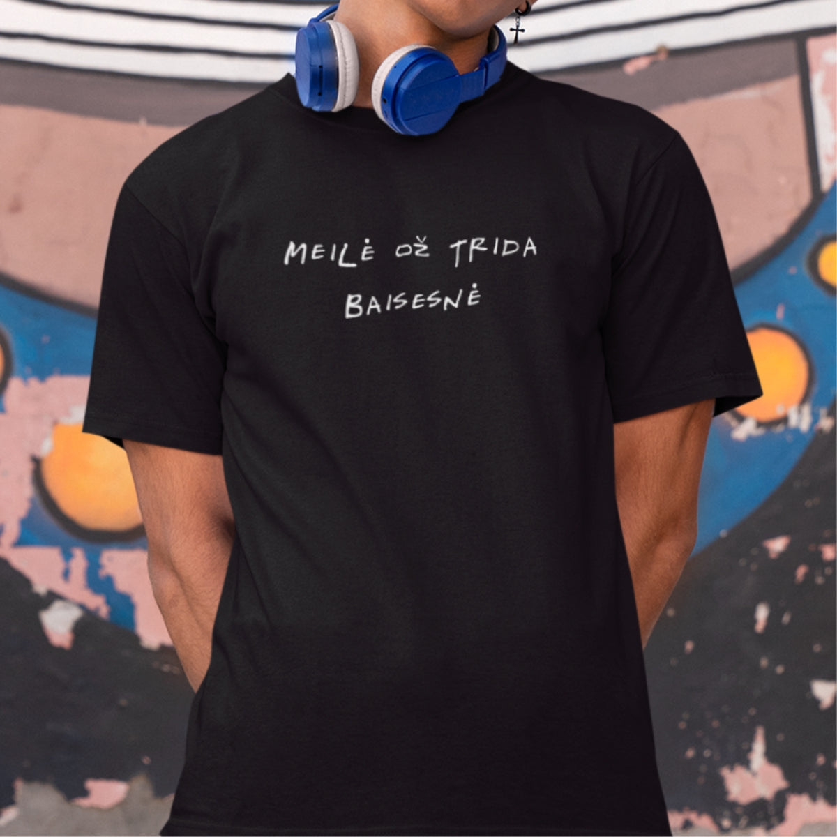 Juodi UNISEX marškinėliai su žemaitišku užrašu "Meilė ož trida baisesnė"