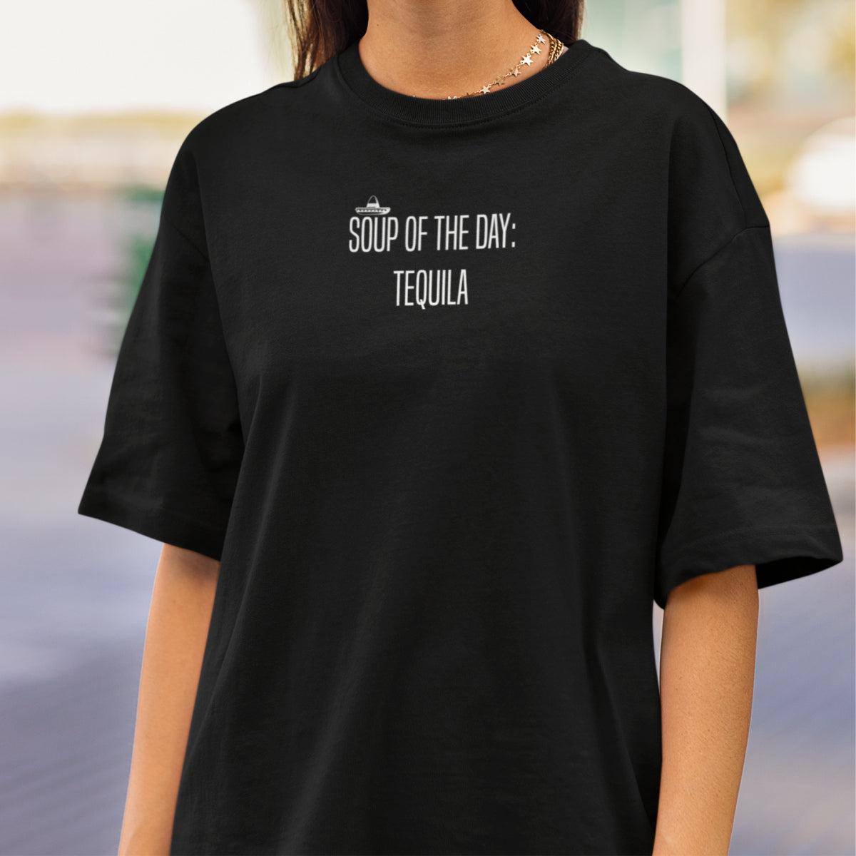 Juodi UNISEX OVERSIZED marškinėliai "Soup ot the day"