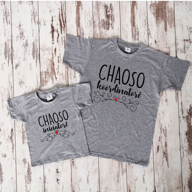 Medvilniniai melanžinės spalvos marškinėliai su linksmais užrašais: "Chaoso koordinatorė" - mamytei, ir "Chaoso iniciatorė" - dukrytei! Nustebinkite mylimus žmones akį traukiančiais marškinėliais!