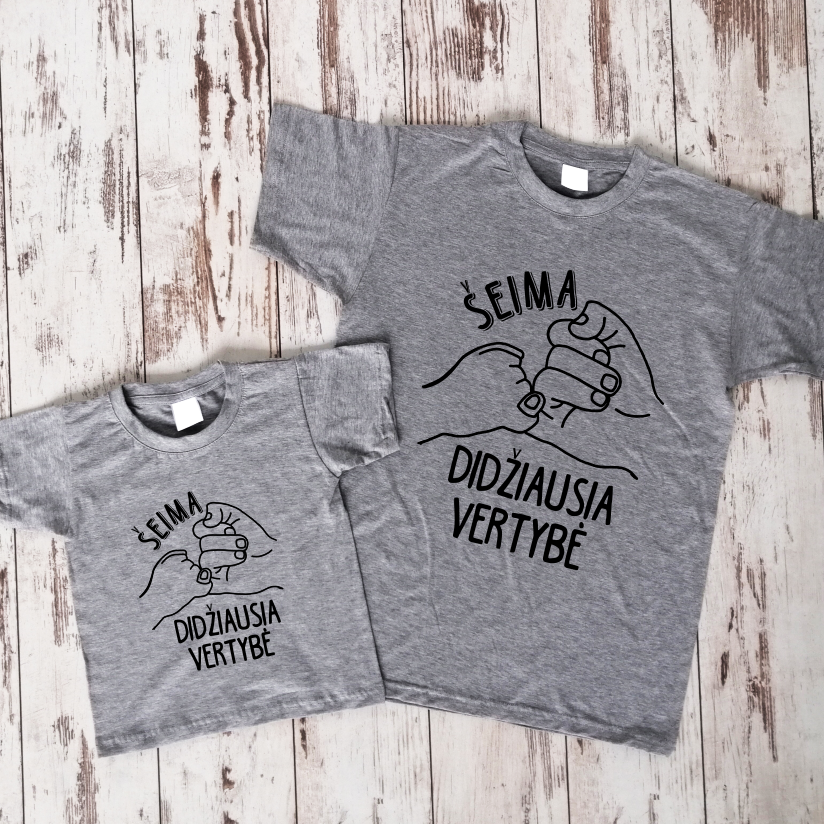 Medvilniniai marškinėliai užrašais „Šeima - didžiausia vertybė“ tėvėliams ir mažyliams. Pradžiuginkite savo artimiuosius šmaikšiomis, nusišypsoti skatinančiais marškinėliais!