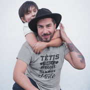 Pilki marškinėliai su juodu užrašu "Tėtis herojus ir pirmoji meilė"