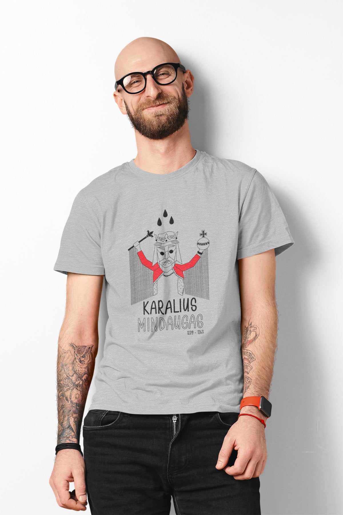 Pilki melanžiniai UNISEX marškinėliai "LDK KARALIUS MINDAUGAS SU UŽRAŠU"