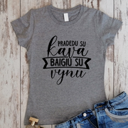 Pilki moteriški medvilniniai marškinėliai "Pradedu su kava, baigu su vynu"