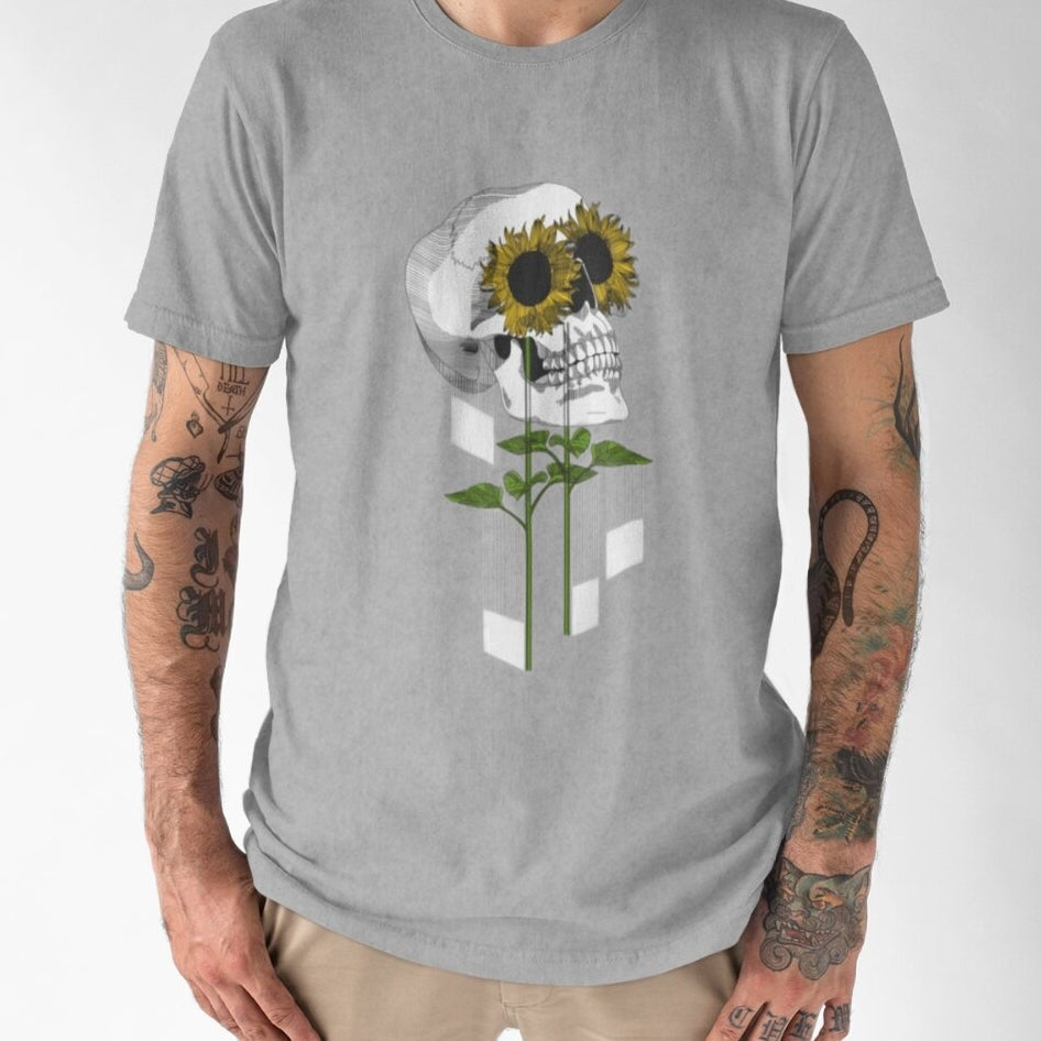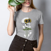 Pilki UNISEX marškinėliai "Kaukolė su geltonom saulėgrąžom“