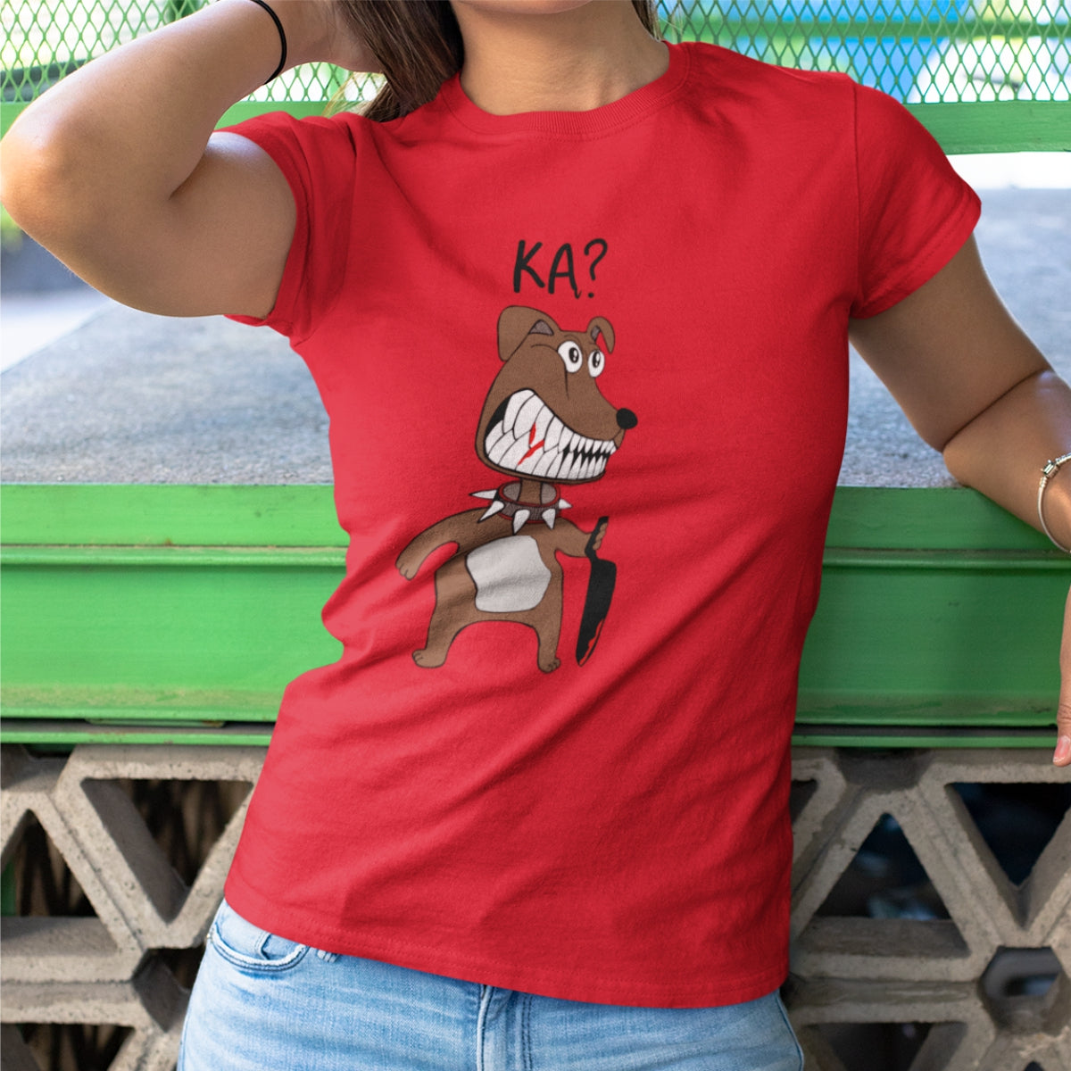 Raudoni moteriški marškinėliai "Ką? Šuniukas"