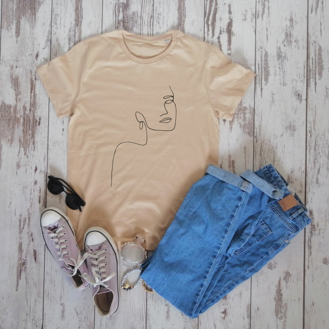 Smėlio spalvos ekologiškos medvilnės marškinėliai "Abstrakti mergina"