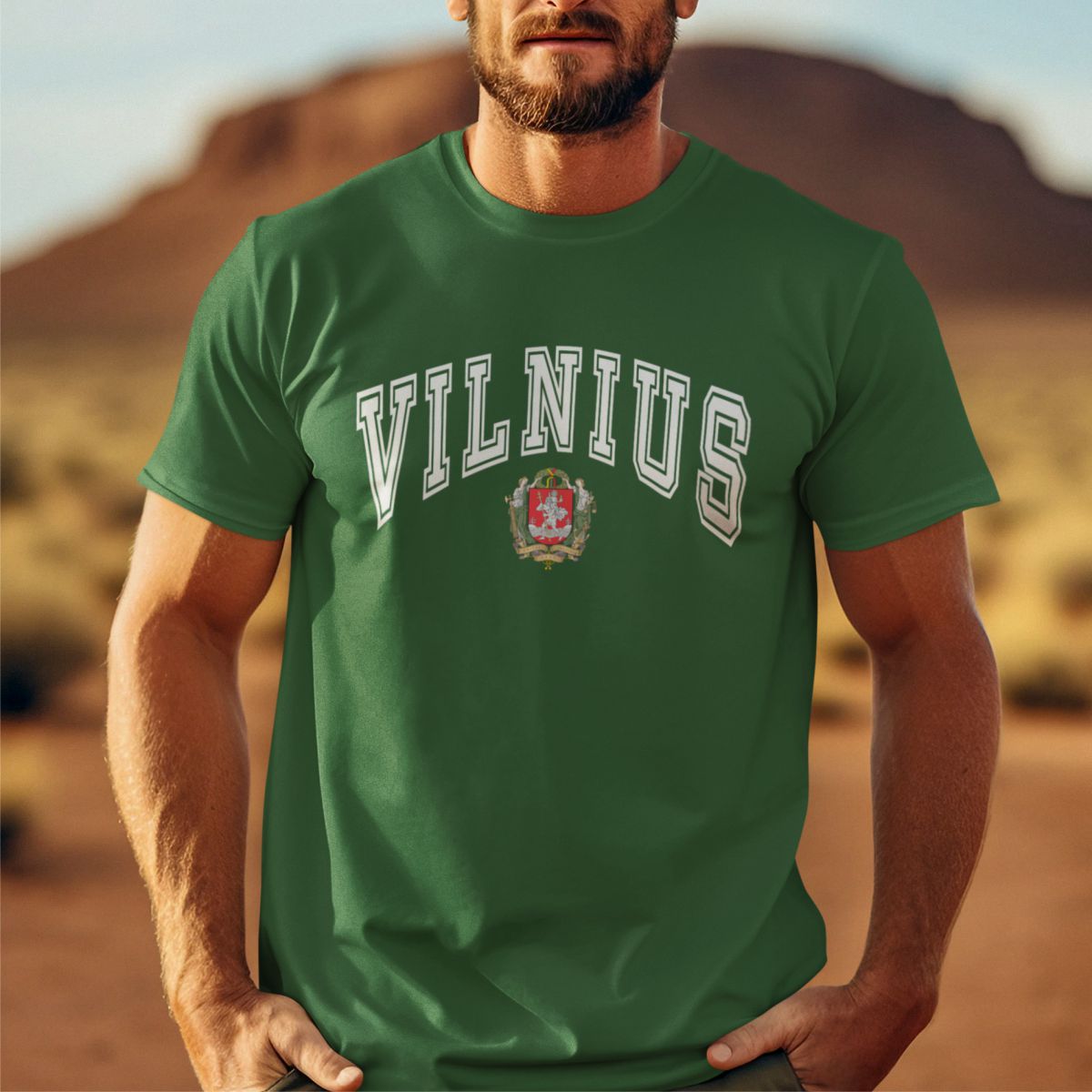 Tamsiai žali UNISEX marškinėliai "Vilnius su herbu"