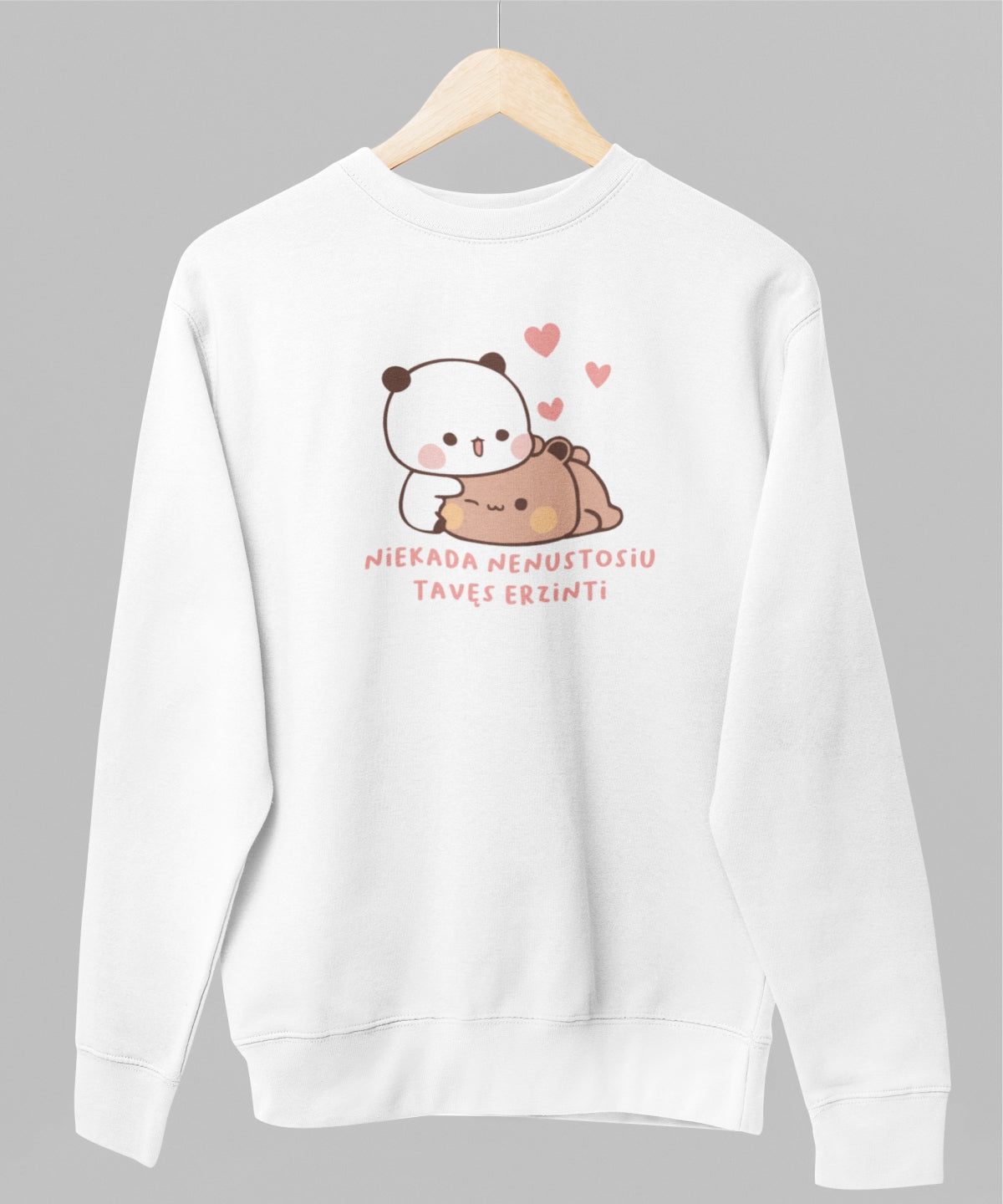 Baltas džemperis be gobtuvo "Niekada nenustosiu tavęs erzinti"
