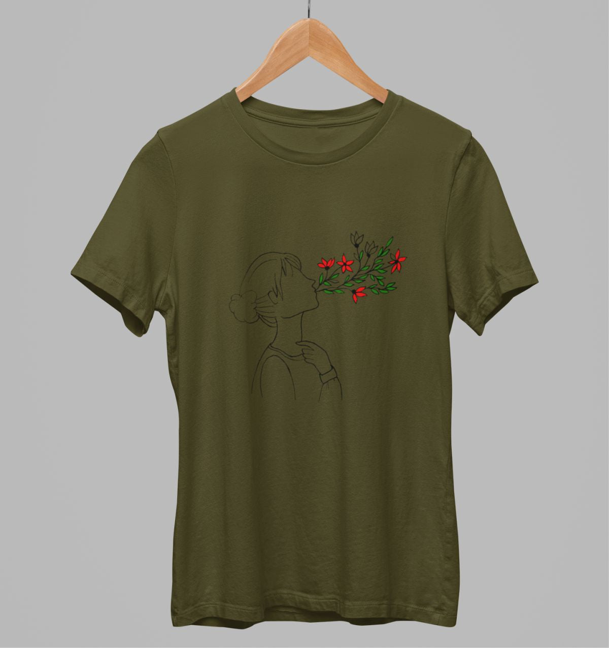 Khaki spalvos 100% medvilnės marškinėliai "Gėlės iš burnos" (L dydis) ŠIURPNAKČIO PASIŪLYMAS