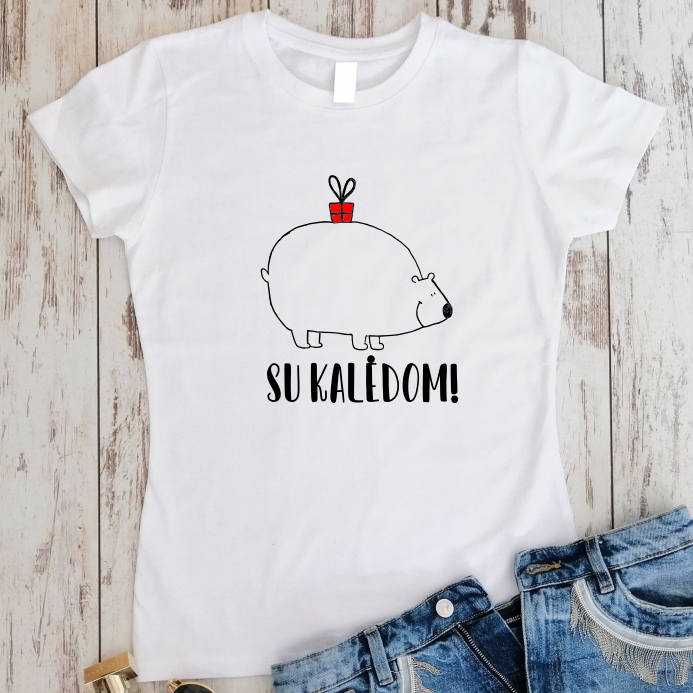 Balti moteriški marškinėliai "Baltoji meška su dovana"