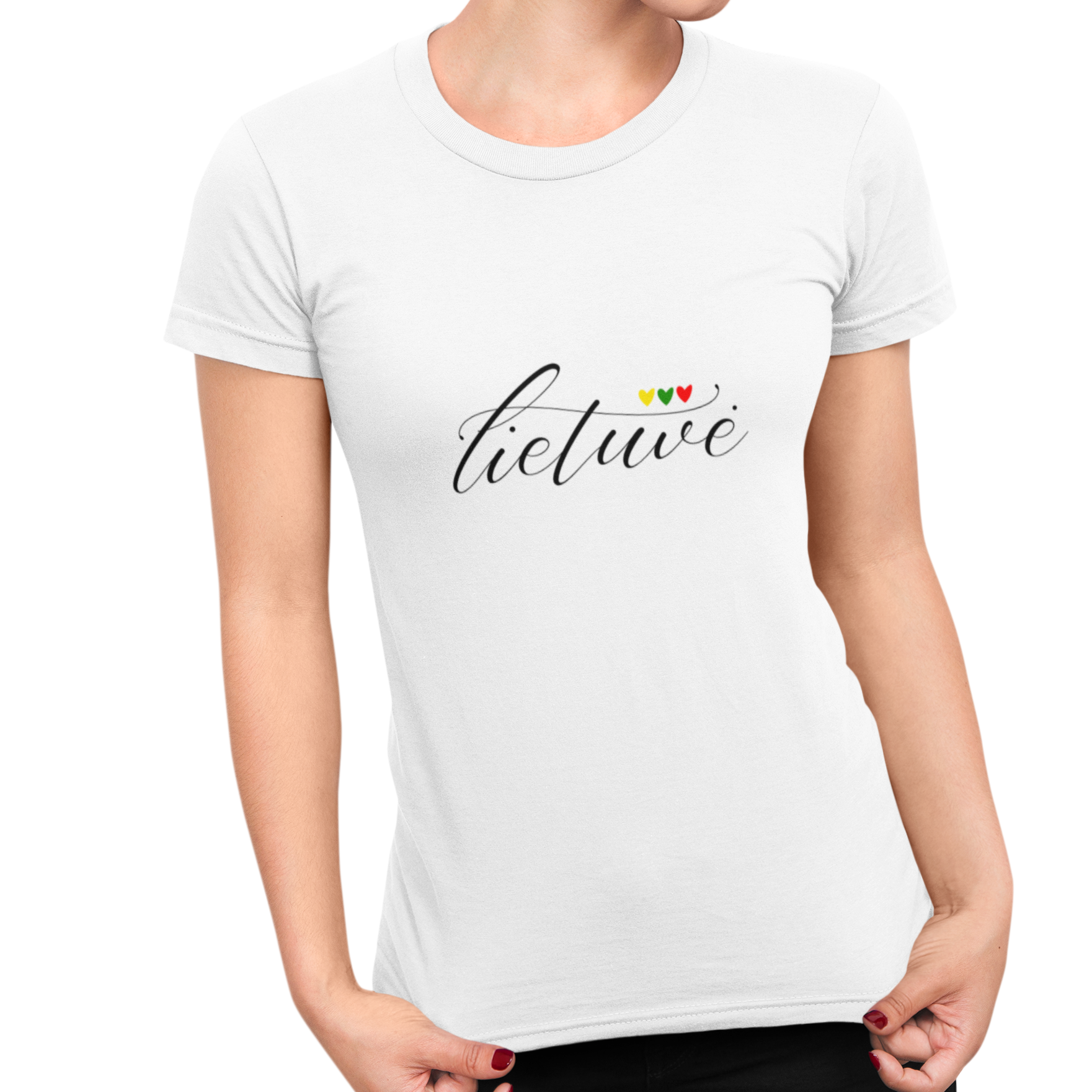 Balti moteriški marškinėliai "Lietuvė su širdelėmis"