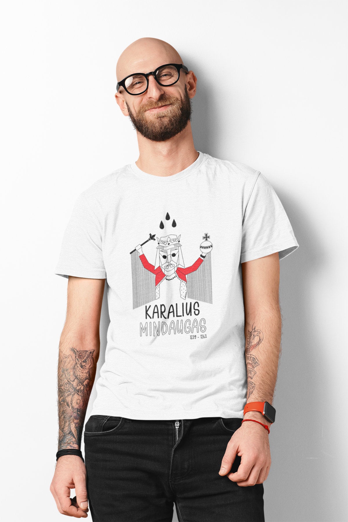 Balti UNISEX marškinėliai "LDK KARALIUS MINDAUGAS SU UŽRAŠU"