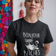 Juodi UNISEX marškinėliai "BONJOUR BITCHES katukas"