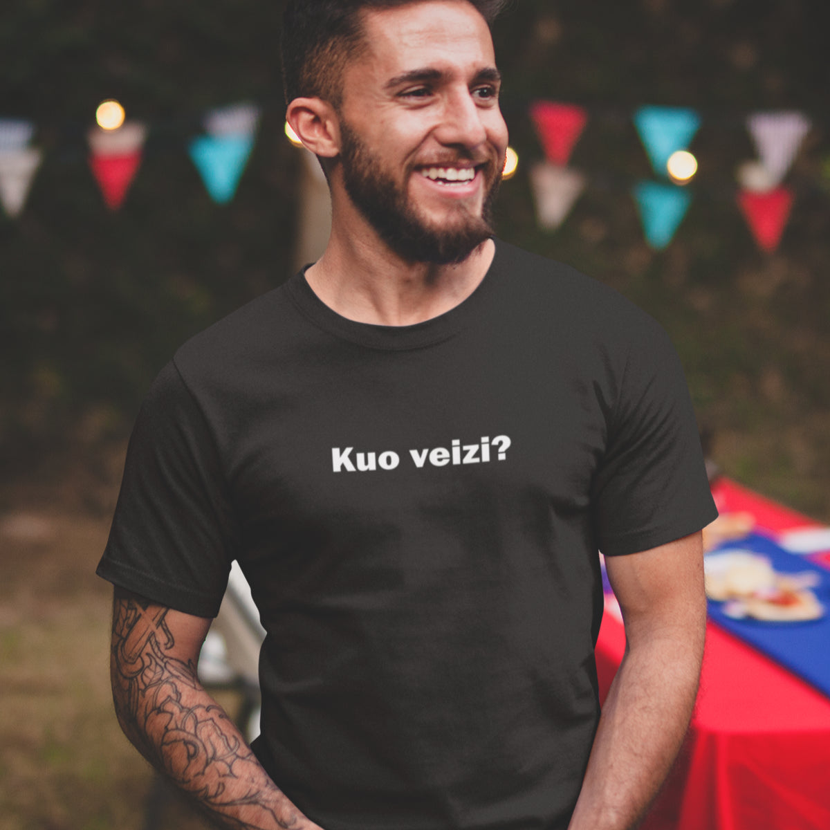 Juodi UNISEX marškinėliai su žemaitišku užrašu "Kuo veizi?"