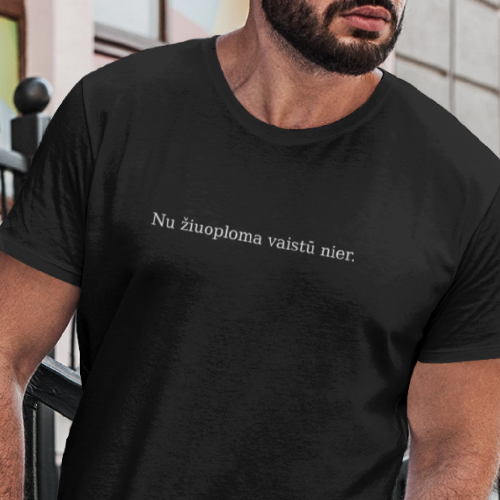 Juodi UNISEX marškinėliai su žemaitišku užrašu "Nu žiuoploma vaistū nier"