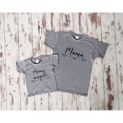 Medvilniniai marškinėliai su užrašais „Mama" mamytei ir „Mamos mergaitė“ mažylei. Pradžiuginkite savo artimiuosius šmaikšiomis, nusišypsoti skatinančiais marškinėliais!