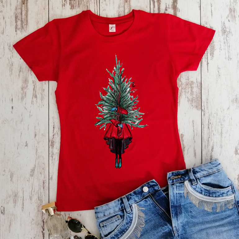 Raudoni moteriški marškinėliai "Mergina su eglute"