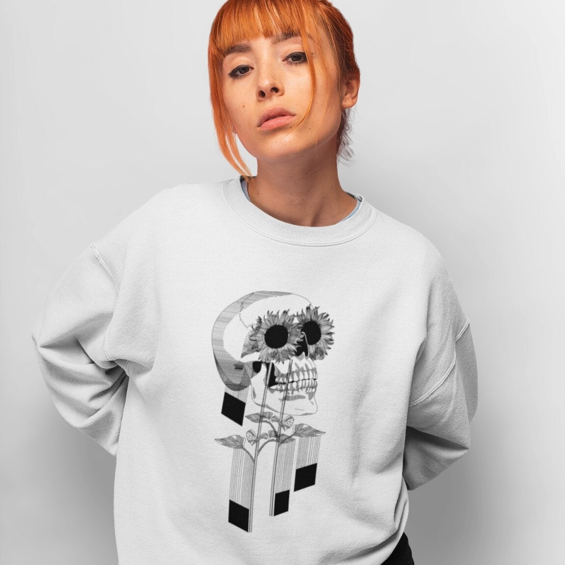 Baltas UNISEX džemperis be gobtuvo "Kaukolė su saulėgrąžom"
