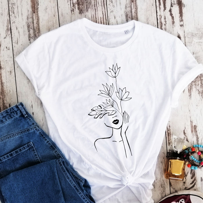 Balti 100% medvilnės marškinėliai "Abstrakti mergina su gėlėmis"